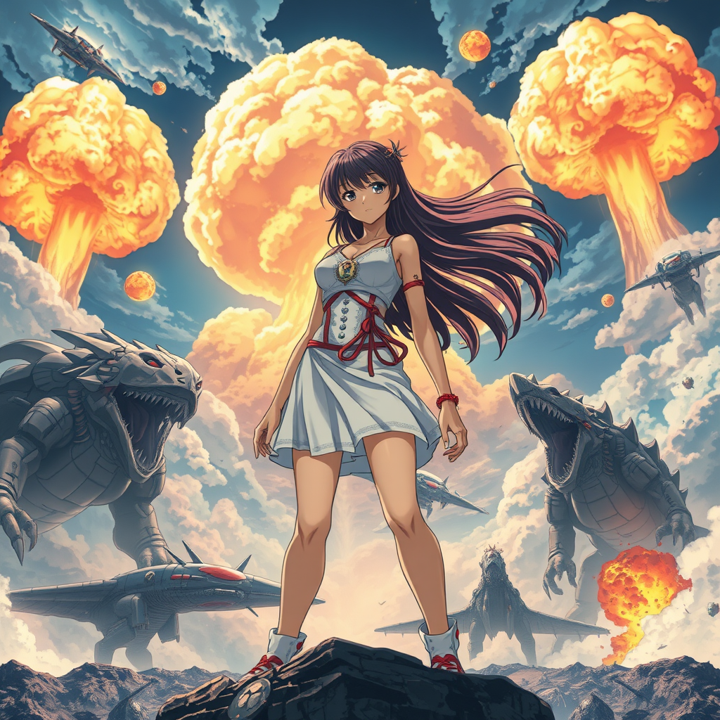 An unbelievably powerful Anime Girl, imagined by the creative geniuses Hideaki Anno, Katsuhiro Otomo, and Rumiko Takahashi, stands as the iconic centerpiece of a cinematic masterpiece poster. Set against a backdrop of epic storytelling mastery, this box office sensation showcases a dramatic scene where colossal monsters and mechanical creatures engage in an intense battle. The sky is dramatically lit with vivid nuclear explosions. Featuring breathtaking 8k detail, the imagery captivates with its grand scale, while the Anime Girl commands attention with her dynamic presence and strength, symbolizing hope amidst chaos. The composition is enhanced with small creative twists, crafting a truly unforgettable visual narrative.
