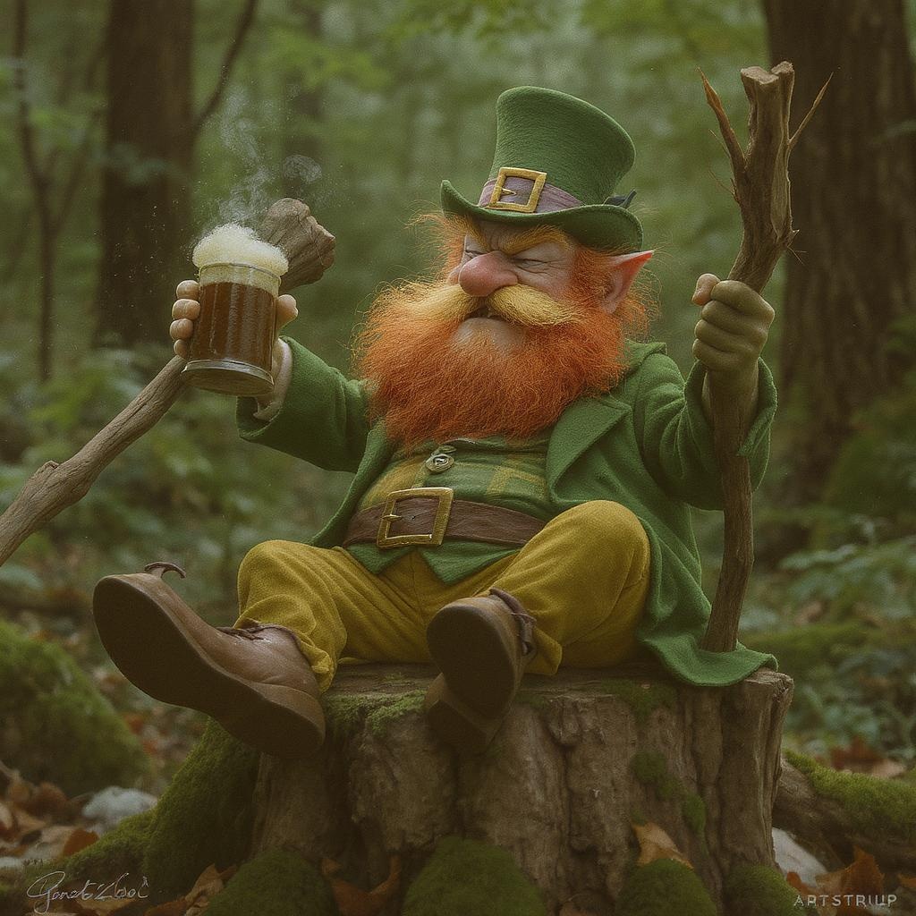 An unkempt leprechaun with a scraggly red beard and a tankard of frothy beer in one hand is comically whacking himself with a gnarled stick in the other hand, seated on a moss-covered stump deep in the forest. Rendered in the whimsical and exaggerated style reminiscent of Herluf Bidstrup, this St. Patrick's Day scene channels the quirky humor of Weird Al Yankovic. Captured as if by a grainy mid-2000s camera, the image is hyper-realistic with an astounding level of detail. The leprechaun's face is depicted with intricate lines and textures, highlighting every peculiar expression. His brightly colored vestments stand out against the verdant forest backdrop, creating a digital masterpiece that is trending on ArtStation. The composition features both a headshot and body shot, meticulously illustrating his cheeky demeanor and odd behavior, with a hint of magic and mischief.