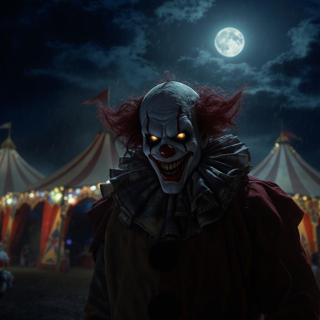 An unsettling clown in disheveled attire looms ominously before a grand circus tent under the cloak of night. The eerie glow of moonlight casts long shadows, highlighting the clown's malevolent grin and sinister eyes. The scene is captured with a cinematic angle that enhances the unsettling atmosphere, while dynamic lighting from behind the tent frames the scene in an otherworldly glow, lending an air of haunting realism to the high-resolution photograph.