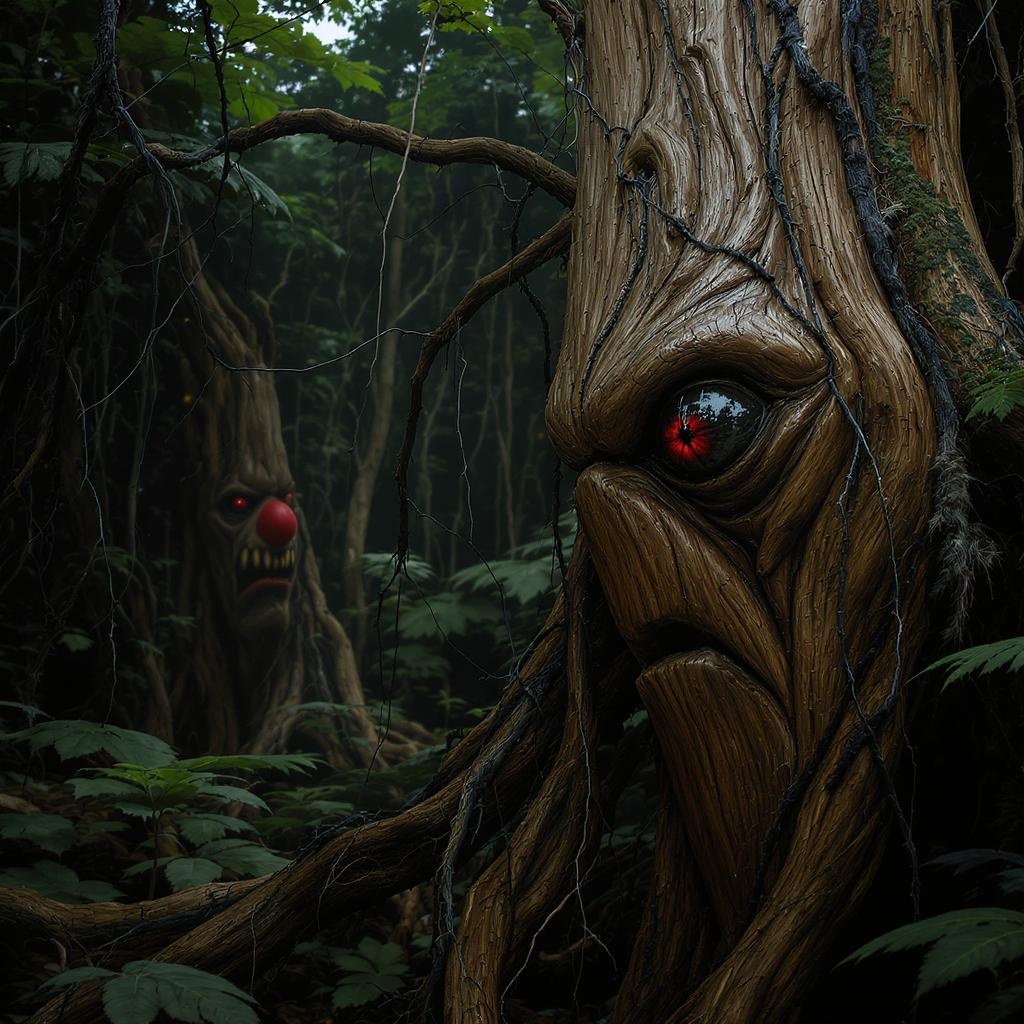 An unsettling wooden entity emerges, its form intricately carved with the mastery reminiscent of Filip Hodas, echoing the essence of colorful woodcarvings. Its singular, piercing red eye gleams ominously, watching intently from the shadows of a mysterious jungle. Rooted deeply in anthropological mystery, this hyper-realistic creature is rendered in stunning detail, capturing every knot and grain in UHD 32k quality. Nearby, a sinister figure with a grotesque red nose blends into the twisted branches of an ancient tree amid the dark forest, brought to life with ZBrush-like precision. The scene is alive with the vibrancy of frogcore elements, weaving a tapestry of Lovecraftian horror and characterful animal portraits, all encapsulated in a DAZ3D-inspired, hyper-detailed masterpiece.