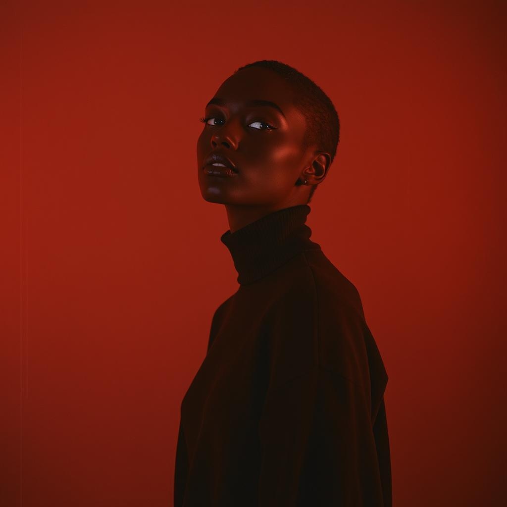 An upper body portrait of a professional model with distinct Greek dark facial features and mismatched eyes, one blue and the other brown. Photographed using a Hasselblad X2D 100C and XCD 90mm f/2.5 lens, the image showcases cinematic red color grading with golden hour warmth. The model strikes an avant-garde pose with a tilted head and a profound gaze, creating a dramatic black silhouette against a burnt umber to red ruby gradient backdrop. They wear a flowing black turtleneck, standing in an elongated stance. The lighting includes a main Fresnel light at a 60-degree angle with silk diffusion, complemented by a rim light with CTO gel at a 75-degree angle. A haze machine adds an ethereal touch, with feathered shadows and meticulous contrast curve manipulation. A grain texture overlays the image, further enhanced by a selective dodge and burn technique, and color temperature transitions from 5500K to 3200K. Ultra-sharp, hyper-realistic details in a rich 16K format draw inspiration from Paolo Roversi's lighting techniques.