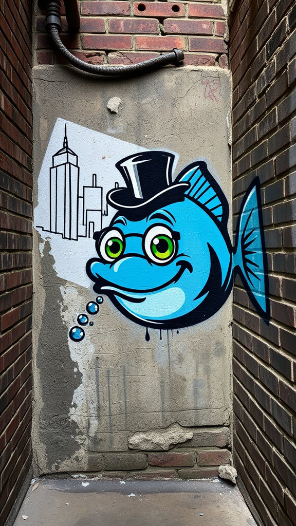 An urban cartoon graffiti of a blue puffer fish with vibrant green eyes, depicted in a Banksy-inspired style, adorns a gritty wall in a New York City alleyway. The puffer fish sports a mischievous grin, with a small top hat tilted jauntily on its head and a monocle over one eye, adding a whimsical twist. The background features subtle hints of the New York skyline sketched in delicate black outlines, blending effortlessly with the urban texture. A few bubbles escape from the puffer fish's mouth, playfully rising toward the mottled brick of the alley. The entire scene is infused with a sense of street-smart charm and artistic flair, capturing the essence of urban creativity.