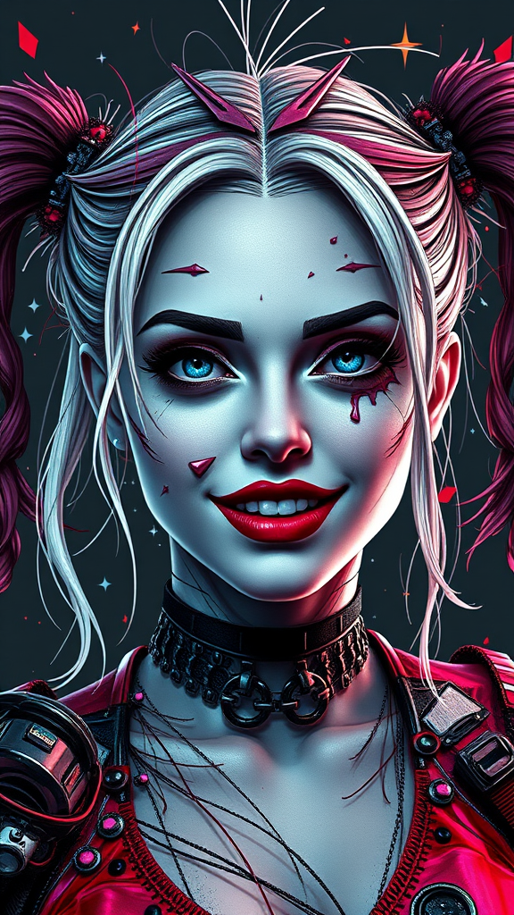 Ana de Armas as Harley Quinn, reimagined in an intricate and abstract portrait. Designed with inspirations from Tooth Wu and WLOP, the piece features vibrant, chaotic energy with elements influenced by Beeple and Dan Mumford. Rendered in octane render, the artwork is trending on ArtStation, embodying Greg Rutkowski's flair for coherence and symmetry, yet uniquely cinematic with hyper-realistic, high-detail textures. The composition boasts an 8k resolution, melding bold colors and dynamic lines, offering a distinct twist while maintaining the core essence of the original prompt.