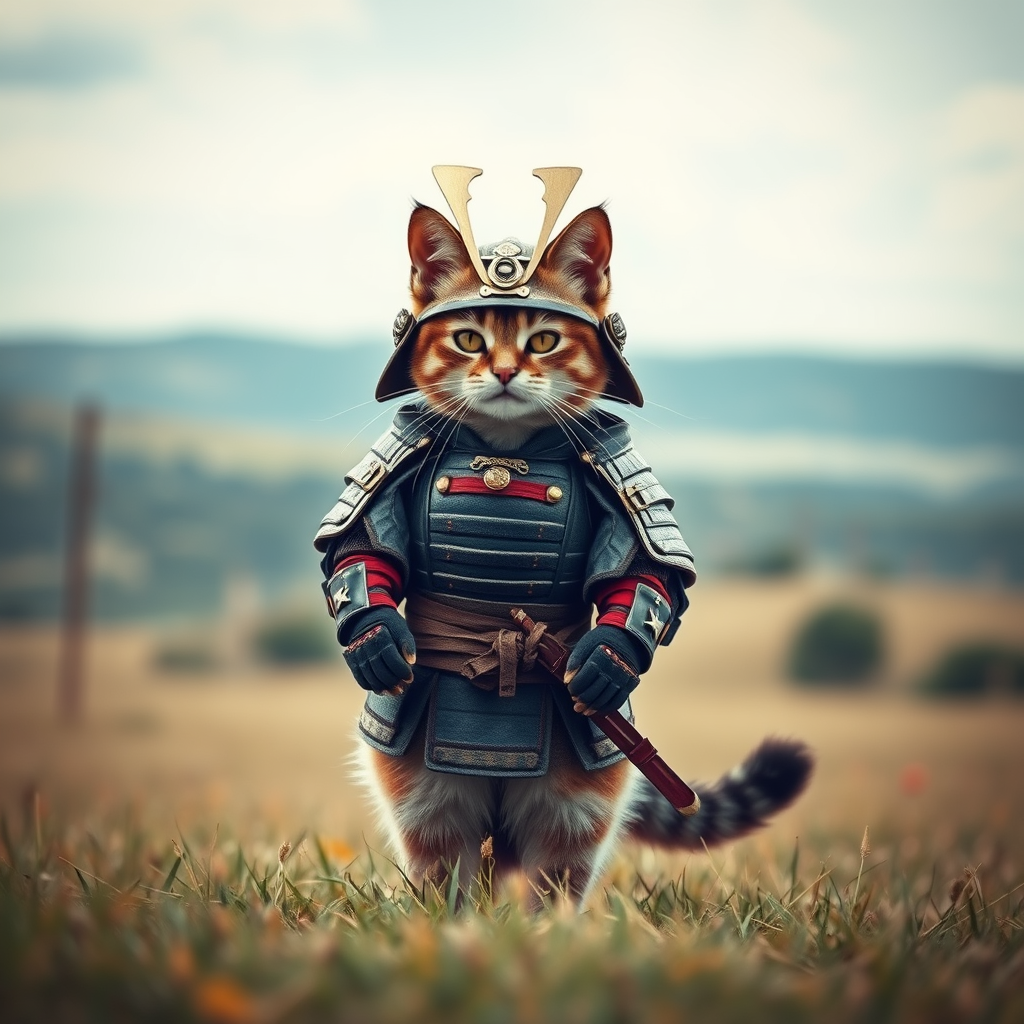 Analog style, charming cat adorned in samurai armor standing in a picturesque open field, embodying the essence of a samurai with intricate detailing, exuding an award-winning appeal. Despite the overall smooth composition, there are subtle quirks like occasional jpeg artifacts and slightly unusual anatomy, with a touch of artistic imperfection. The scene captures a sense of whimsy and surreal beauty, invoking a balance of unique charm with its slightly blurred and fuzzy edges, creating a wonderfully imaginative depiction.