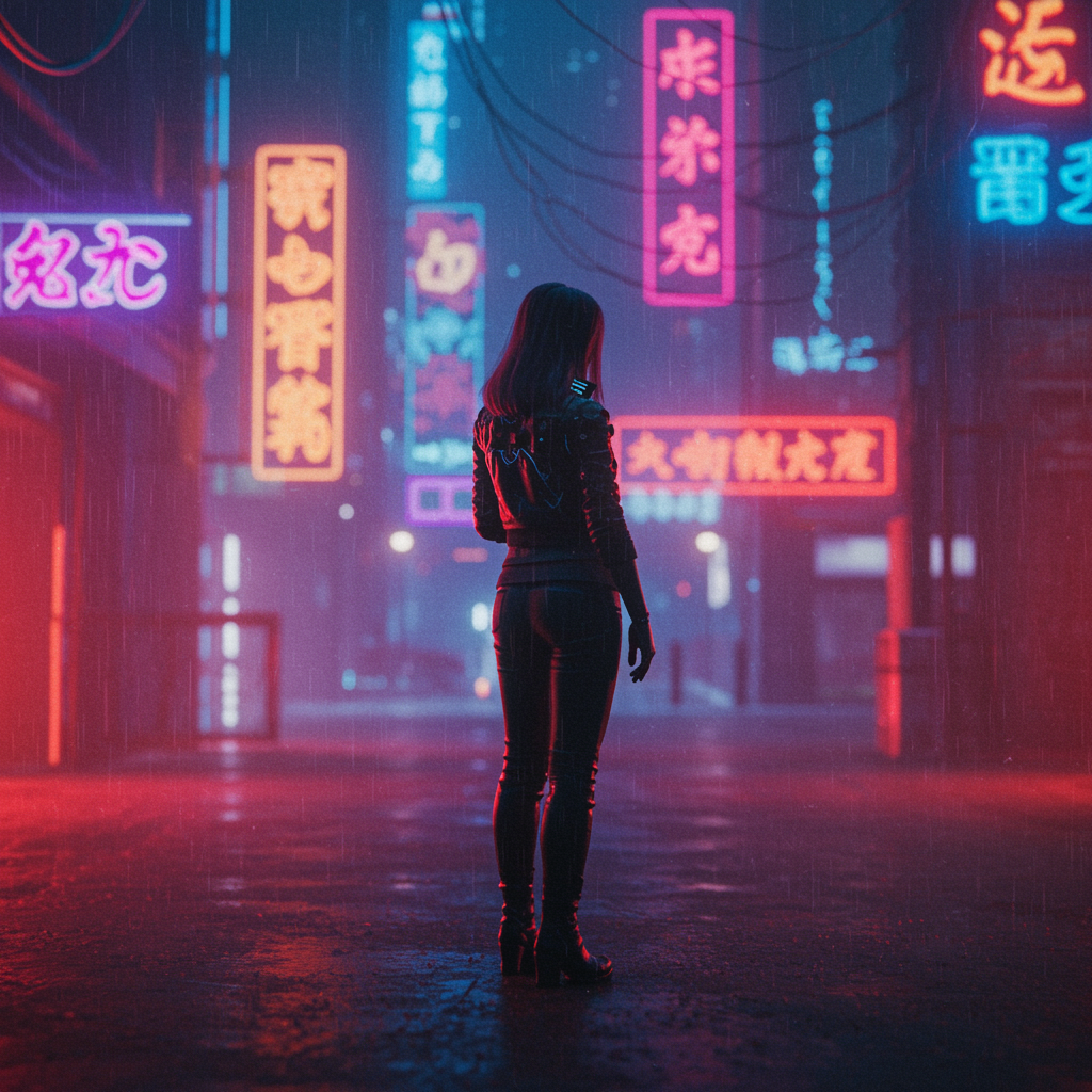 Analog style photograph of a solitary woman standing in the rain, accentuated by vibrant neon lights. Cyberpunk aesthetic in a futuristic cityscape. Captured with Canon EF 50mm f/1.8 STM Lens. Set in the year 2077, featuring hyperrealistic details with raytracing effects and dynamic depth of field, full of vivid colors. Cinematic, intricately detailed with rim lighting, with a moody, atmospheric touch. Intentional artifacts like text errors, cropped elements, distorted anatomy, unusual digits, and low resolution add an uncanny, surreal quality.