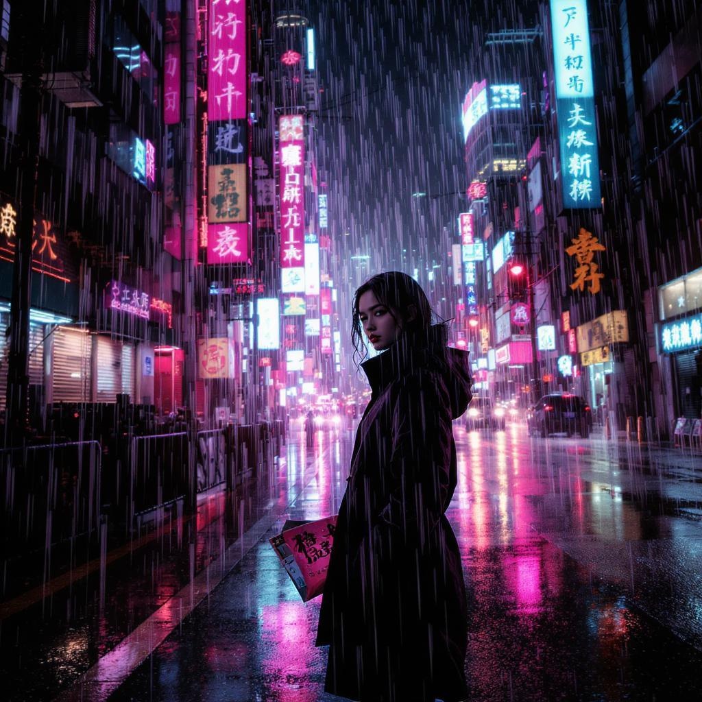 analog style photograph of a woman standing alone in the rain illuminated by vibrant neon lights cyberpunk night city Canon EF 50mm f/1.8 STM lens futuristic 2077 hyperrealistic atmosphere advanced raytracing intricate depth of field bursting with color cinematic experience extremely detailed with dramatic rim lighting mysterious ambiance realistic composition visually striking elements stads narrative focus storytelling candid moment fine art photography