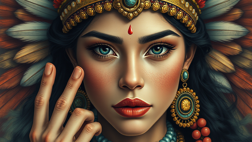 Analog style portrait of a Guatemalan goddess depicted in full body with a sharp focus on her detailed and gorgeous face. The portrayal is realistic and hyperrealistic, with a cinematic illustration that is highly detailed. The image includes intentional artistic quirks such as missing fingers, extra digits, and fewer digits, along with cropped elements and intentional low quality to echo a tactile, analog feel. Elements of jpeg artifacts, bad anatomy, and extra limbs are creatively incorporated to evoke a surreal, dream-like quality. The piece may feature poorly drawn hands and feet, adding to the unique artistic interpretation, with disfigured or out-of-frame elements introducing a sense of movement and narrative. Additionally, tiling and deformed aspects are used to convey a sense of abstraction, while blurry and misshaped areas suggest an emotional depth. Watermarks and signatures are included to emphasize the authenticity of an artistic process.
