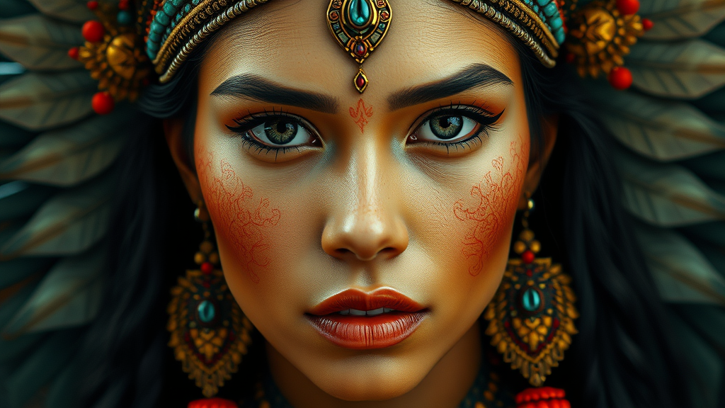 Analog style portrait of a Guatemalan goddess, full body capture in sharp focus, featuring a detailed and gorgeous face, realistic and hyperrealistic elements with a cinematic illustration feel. The artwork is highly detailed with a low-resolution texture, including intentional imperfections such as text errors, anatomical anomalies like missing or extra digits, and composition quirks like cropping. Elements are designed to challenge conventional aesthetics with aspects like poor-quality artifacts, ambiguous anatomy, intentionally misplaced limbs, and other features that evoke a sense of distorted reality. The work incorporates visual noise such as watermark imitations and embraces an avant-garde style with unconventional execution.