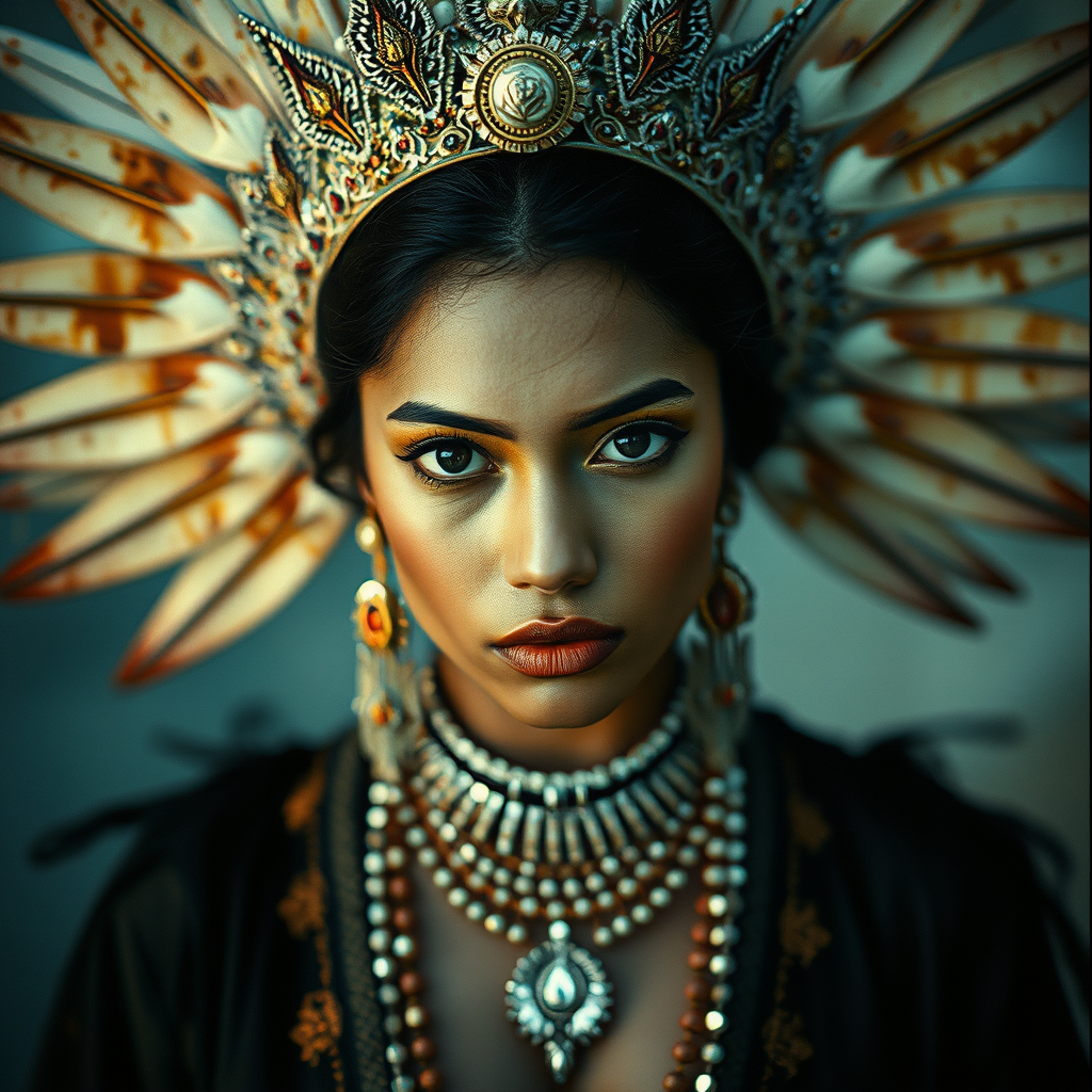 analog style portrait of a Guatemalan goddess full body sharp focus detailed stunning face realistic hyperrealistic cinematic illustration highly detailed with intentional imperfections textural errors and artistic glitches slightly surreal with subtle anomalies like unusual limb proportions and abstract elements blending into a beautifully imperfect aesthetic softly blurred edges and organic textures creating a dreamlike quality, capturing both the essence and mystique of a divine figure through an experimental lens