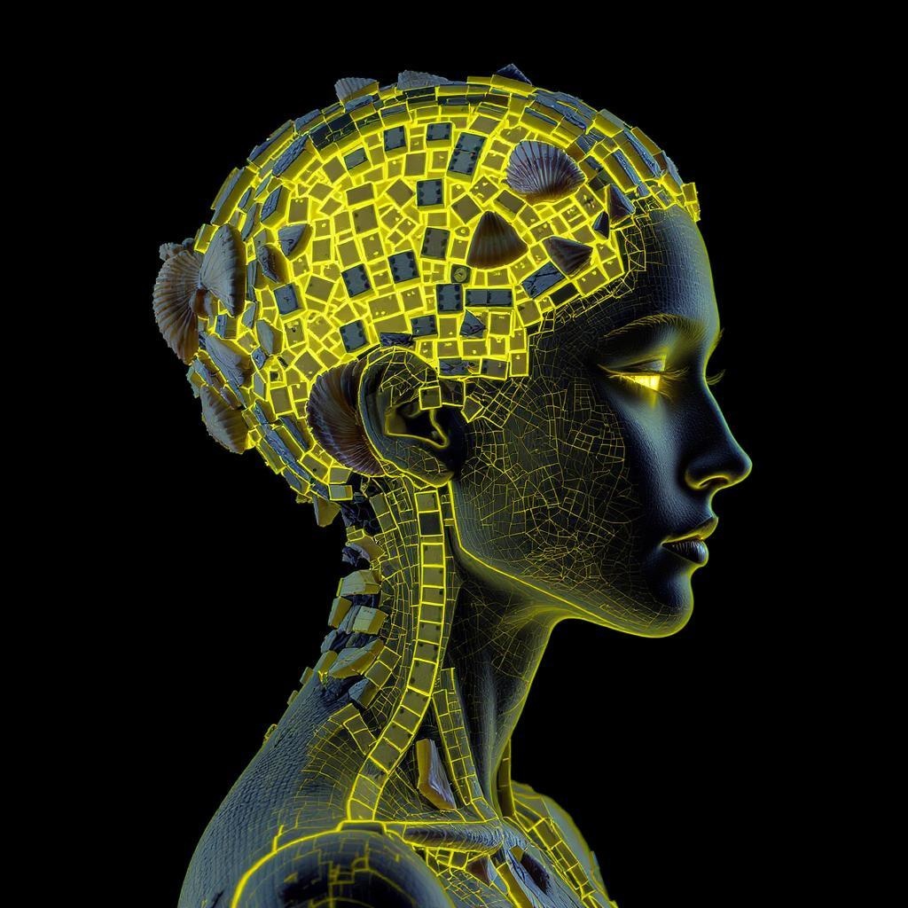 Anatomy of a woman's head crafted from glowing neon yellow domino pieces and fragmented sea shells, evoking an Octopath Traveler aesthetic; infused with vanitas themes, featuring angular, altermodern elements, and surreal touches; emphasizing raw texture and intricate details.