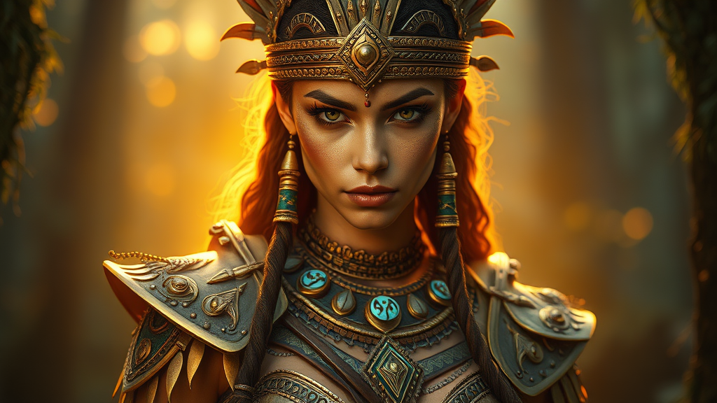 Ancient Amazon warrior princess, hyper-realistic, intricately detailed, ethereal glow, dynamic golden hour lighting, high dynamic range, in a mystical forest setting, adorned with ornate armor and symbolic war paint, eyes fierce and determined, surrounded by whispering spirits of the forest, tall and commanding presence, vivid colors with a dreamlike atmosphere.