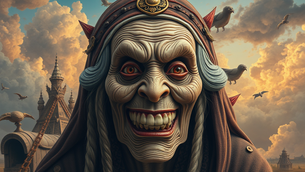 Ancient bewildered grandmother with a malevolent grin, sky filled with surreal illusions, inspired by Mundford, baroque maximalism, chibi style with touches of Artificial Nightmares, echoes of Stanley Artgerm and Tim Burton. Features are intricately detailed with piercing eyes, highly photorealistic and lifelike. The scene is ultra-realistic with organic, dynamic elements, boasting high-definition quality. The composition is immaculate, with breathtaking, intricate details reminiscent of a flawless octane render. This artwork is trending on artstation, 8k artistic photography at its finest, embodying photorealistic concept art. The setting is graced with gentle, natural volumetric light, perfect for a cinematic feel using chiaroscuro techniques. An award-winning masterpiece oil on canvas, drawing inspiration from the styles of Raphael, Caravaggio, Greg Rutkowski, Beeple, Beksinski, and Giger, with slight creative twists while preserving the essence of the original vision.