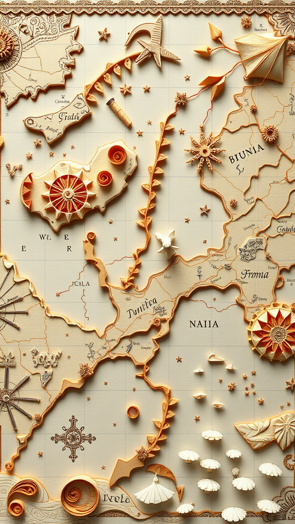 Ancient cartographic design, intricately rolled paper quilling, elaborate paper cut artistry, paper-crafted illustration, hyper-detailed, ultra-high resolution