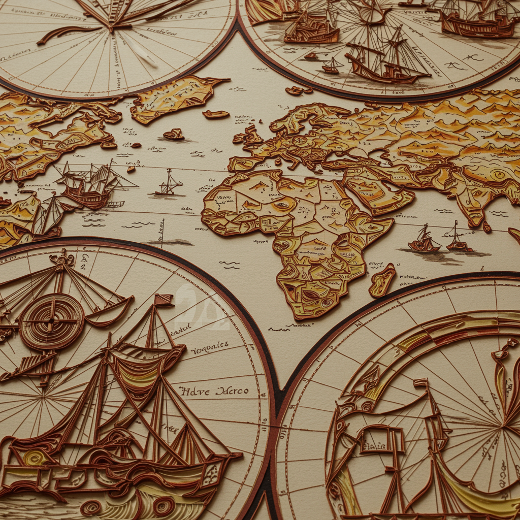 Ancient cartography meets intricate paper craftsmanship in a detailed fusion of paper quilling and paper cut art, where 8k resolution brings historical maps to life through exquisite paper illustration, capturing the essence of exploration with subtle creative twists and refined artistic depth.