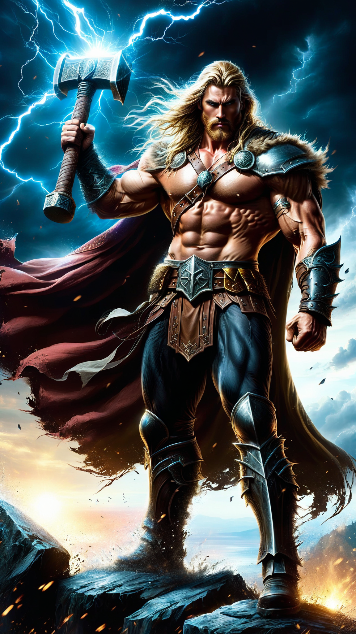 Ancient cleric of Thor, Viking warrior and mystic. He is a healer and controller of weather--- but he mostly brings the lightning and thunder during battle. He is also a true Viking warrior. He wields a large metal war hammer, just like his pstron diety. Tall, muscular, big muscles, strong, fit. Wide back, broad chest, narrow waist, sinewy. Handsome masculine rugged face with icy blue eyes, strong brow and jaw, neatly trimmed mustache and Beard. He is strawberry-blonde, long shoulder length hair side parted and volumous. He wears a golden metal circlet around his head, it shines and glistens in the sunlight. He is bare chested, but wears heavy gold chain around his neck with s golden Viking hammer symbol. Gold metal pauldrons and shoulder pads on his shoulders. Brown leather o-ring harness on his massive chest. Brown leather bracers on his arms, thick brown leather belt around his waist, both adorned with bronze rivets. Black warrior pants on his muscular legs, brown leather knee-high boots on his feet. A dark crimson cloak on his back, blowing in the wind. He holds up his war hammer in his fist, his muscular arm raised up to the sky, the long hairs under his arm very visible. Full body pose, warroir stance and challenging the forces of darkness. He brings the lightning and the light.