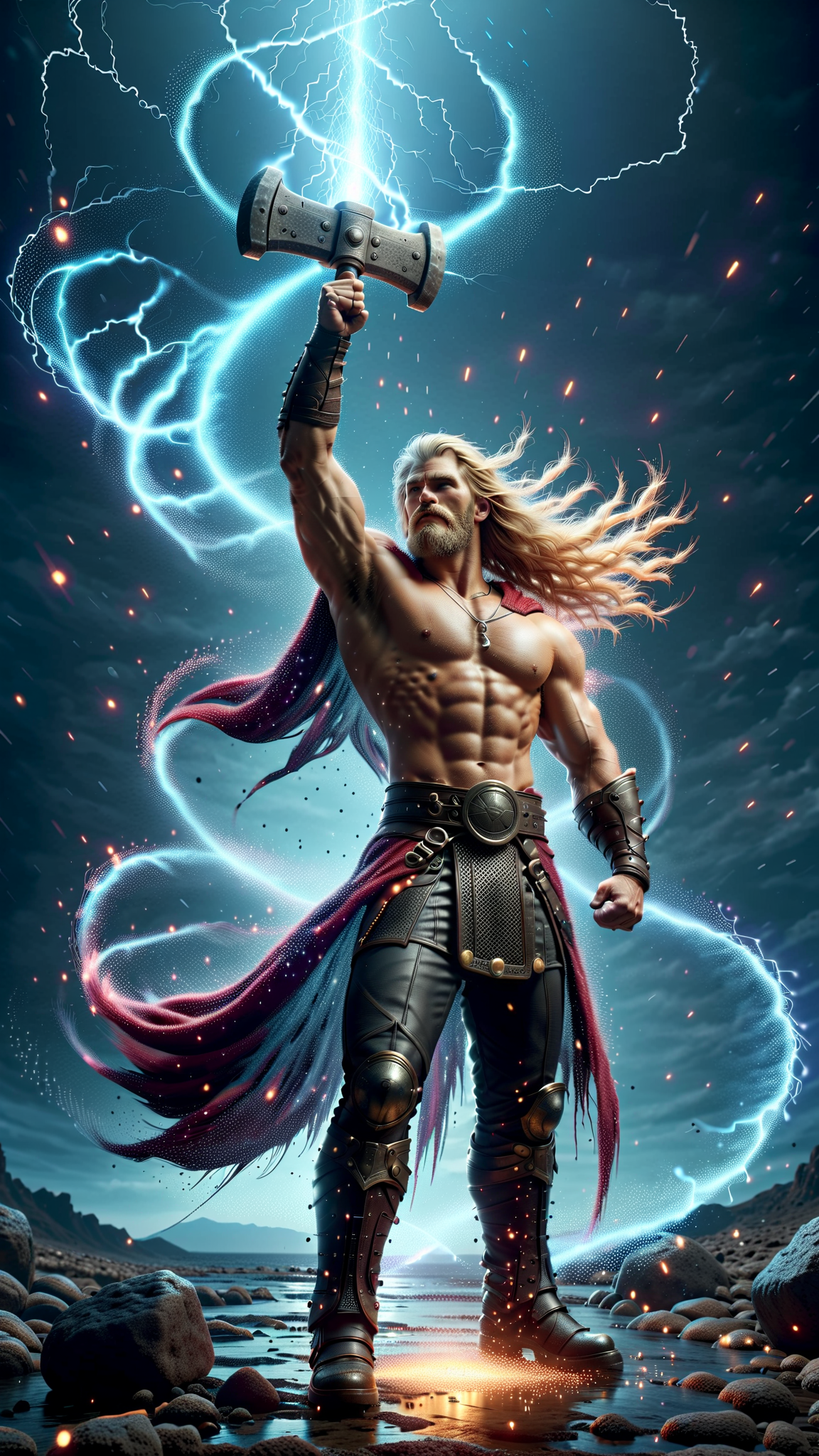 Ancient cleric of Thor, Viking warrior and mystic. He is a healer and controller of weather--- but he mostly brings the lightning and thunder during battle. He is also a true Viking warrior. He wields a large metal war hammer, just like his pstron diety. Tall, muscular, big muscles, strong, fit. Wide back, broad chest, narrow waist, sinewy. Handsome masculine rugged face with icy blue eyes, strong brow and jaw, neatly trimmed mustache and Beard. He is strawberry-blonde, long shoulder length hair side parted and volumous. He wears a golden metal circlet around his head, it shines and glistens in the sunlight. He is bare chested, but wears heavy gold chain around his neck with s golden Viking hammer symbol. Gold metal pauldrons and shoulder pads on his shoulders. Brown leather o-ring harness on his massive chest. Brown leather bracers on his arms, thick brown leather belt around his waist, both adorned with bronze rivets. Black warrior pants on his muscular legs, brown leather knee-high boots on his feet. A dark crimson cloak on his back, blowing in the wind. He holds up his war hammer in his fist, his muscular arm raised up to the sky, the long hairs under his arm very visible. Full body pose, warroir stance and challenging the forces of darkness. He brings the lightning and the light.