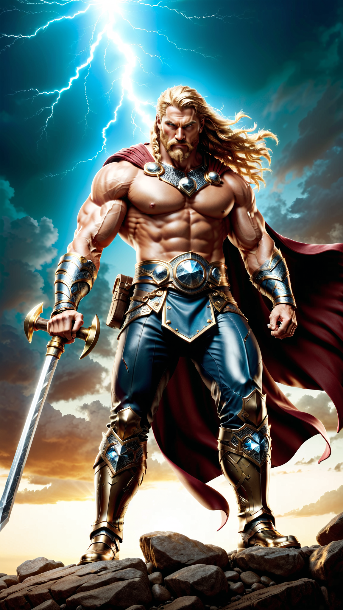 Ancient cleric of Thor, Viking warrior and mystic. He is a healer and controller of weather--- but he mostly brings the lightning and thunder during battle. He is also a true Viking warrior. He wields a large metal war hammer, just like his pstron diety. Tall, muscular, big muscles, strong, fit. Wide back, broad chest, narrow waist, sinewy. Handsome masculine rugged face with icy blue eyes, strong brow and jaw, neatly trimmed mustache and Beard. He is strawberry-blonde, long shoulder length hair side parted and volumous. He wears a golden metal circlet around his head, it shines and glistens in the sunlight. He is bare chested, but wears heavy gold chain around his neck with s golden Viking hammer symbol. Gold metal pauldrons and shoulder pads on his shoulders. Brown leather o-ring harness on his massive chest. Brown leather bracers on his arms, thick brown leather belt around his waist, both adorned with bronze rivets. Black warrior pants on his muscular legs, brown leather knee-high boots on his feet. A dark crimson cloak on his back, blowing in the wind. He holds up his war hammer in his fist, his muscular arm raised up to the sky, the long hairs under his arm very visible. Full body pose, warroir stance and challenging the forces of darkness. He brings the lightning and the light.