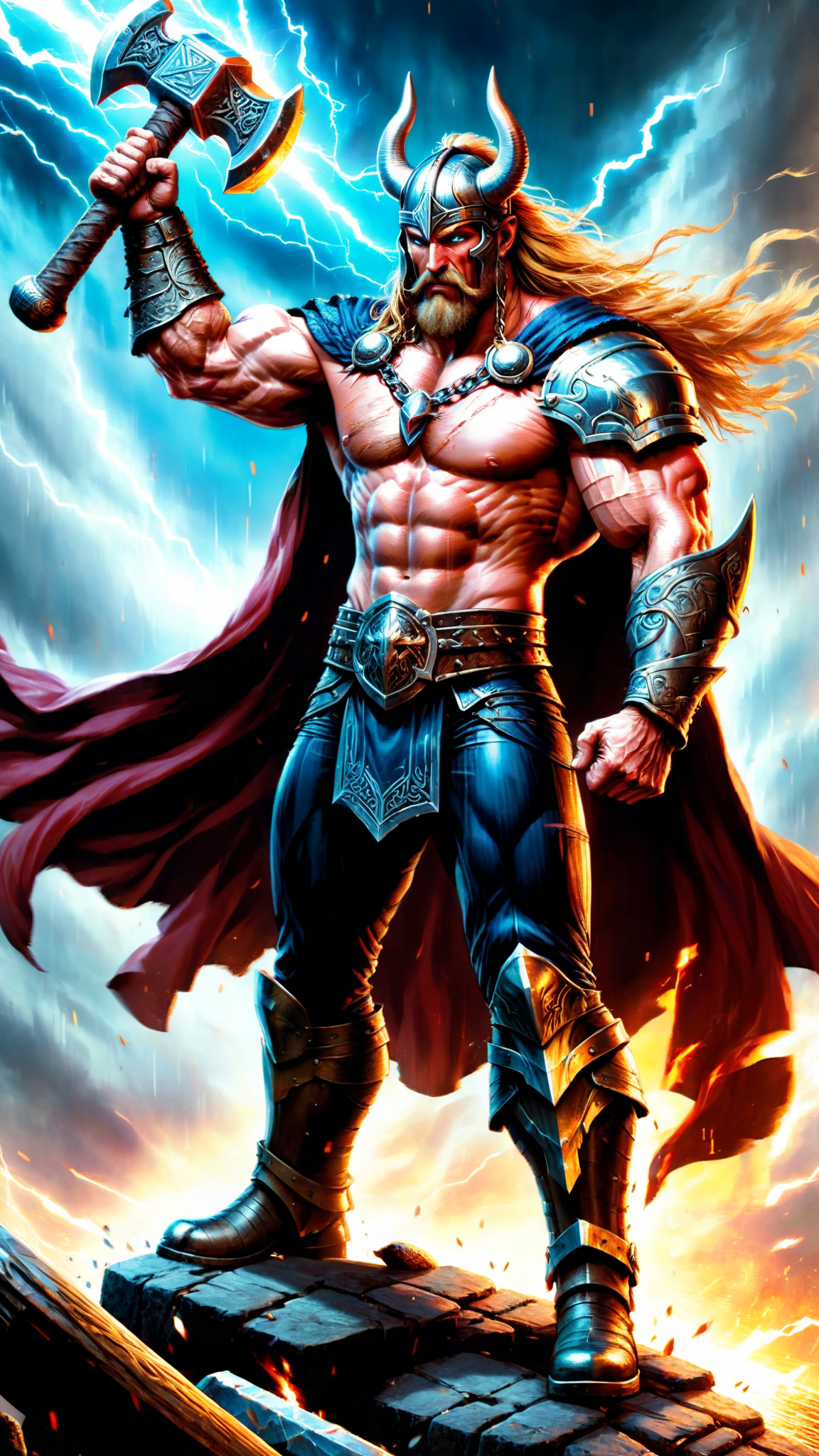 Ancient cleric of Thor, Viking warrior and mystic. He is a healer and controller of weather--- but he mostly brings the lightning and thunder during battle. He is also a true Viking warrior. He wields a large metal war hammer, just like his pstron diety. Tall, muscular, big muscles, strong, fit. Wide back, broad chest, narrow waist, sinewy. Handsome masculine rugged face with icy blue eyes, strong brow and jaw, neatly trimmed mustache and Beard. He is strawberry-blonde, long shoulder length hair side parted and volumous. He wears a golden metal circlet around his head, it shines and glistens in the sunlight. He is bare chested, but wears heavy gold chain around his neck with s golden Viking hammer symbol. Gold metal pauldrons and shoulder pads on his shoulders. Brown leather o-ring harness on his massive chest. Brown leather bracers on his arms, thick brown leather belt around his waist, both adorned with bronze rivets. Black warrior pants on his muscular legs, brown leather knee-high boots on his feet. A dark crimson cloak on his back, blowing in the wind. He holds up his war hammer in his fist, his muscular arm raised up to the sky, the long hairs under his arm very visible. Full body pose, warroir stance and challenging the forces of darkness. He brings the lightning and the light.