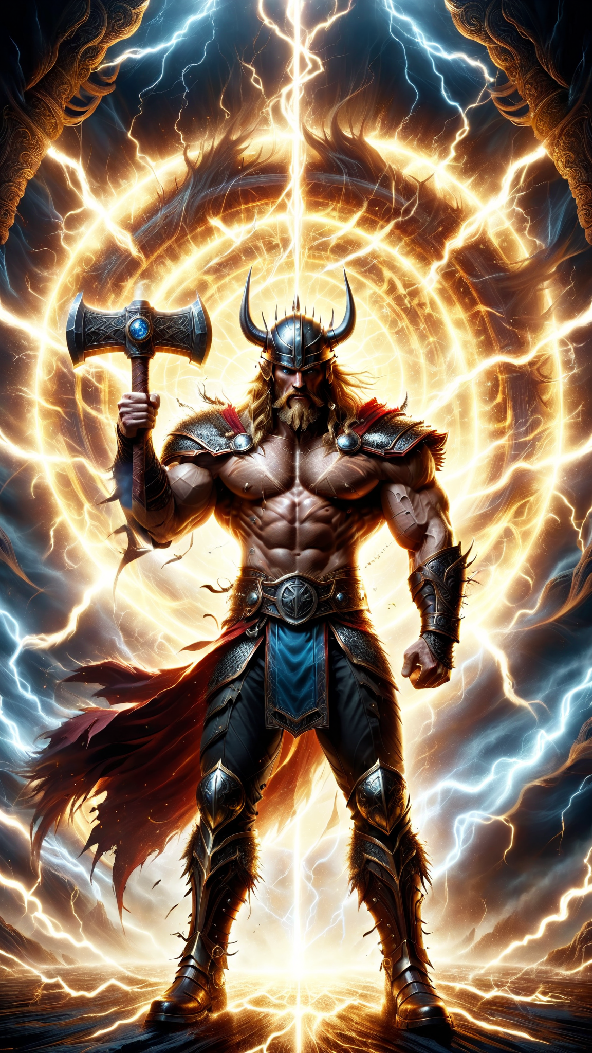 Ancient cleric of Thor, Viking warrior and mystic. He is a healer and controller of weather--- but he mostly brings the lightning and thunder during battle. He is also a true Viking warrior. He wields a large metal war hammer, just like his pstron diety. Tall, muscular, big muscles, strong, fit. Wide back, broad chest, narrow waist, sinewy. Handsome masculine rugged face with icy blue eyes, strong brow and jaw, neatly trimmed mustache and Beard. He is strawberry-blonde, long shoulder length hair side parted and volumous. He wears a golden metal circlet around his head, it shines and glistens in the sunlight. He is bare chested, but wears heavy gold chain around his neck with s golden Viking hammer symbol. Gold metal pauldrons and shoulder pads on his shoulders. Brown leather o-ring harness on his massive chest. Brown leather bracers on his arms, thick brown leather belt around his waist, both adorned with bronze rivets. Black warrior pants on his muscular legs, brown leather knee-high boots on his feet. A dark crimson cloak on his back, blowing in the wind. He holds up his war hammer in his fist, his muscular arm raised up to the sky, the long hairs under his arm very visible. Full body pose, warroir stance and challenging the forces of darkness. He brings the lightning and the light.