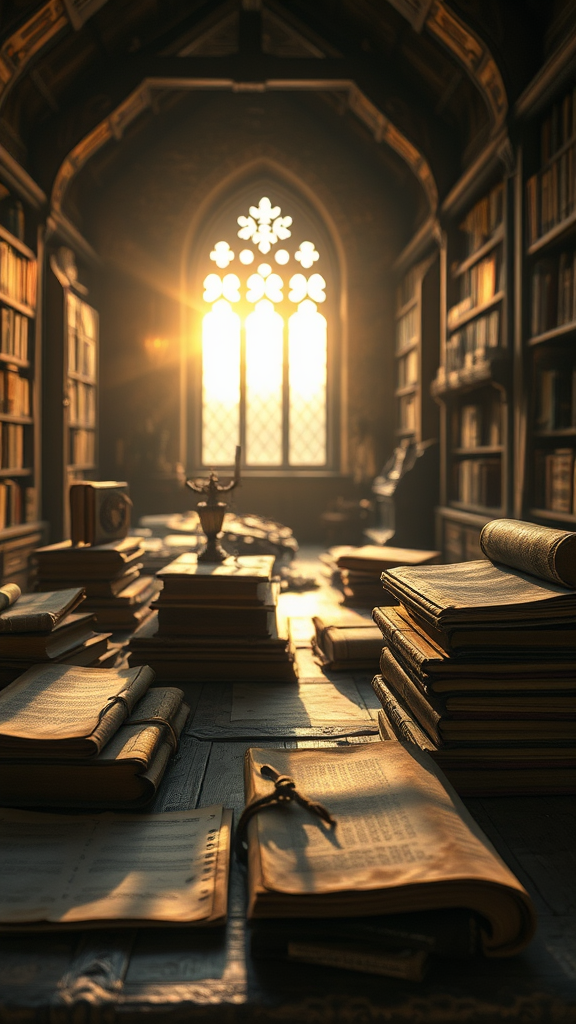 Ancient dust-laden and weathered spellbooks and scrolls in a medieval library setting, captured during the magic hour, showcasing expert-level photography in high-resolution with an octane render for hyper realism. The scene is bathed in breathtaking sunlight, with a dynamic composition that emphasizes sharp focus and an elegant bokeh effect. The atmosphere evokes a sense of analog charm, with some elements slightly spilling out of frame to add intrigue. A subtle, childlike wonder pervades the ambiance, maintaining a realistic aesthetic without diverting into cartoonish or low-resolution areas, ensuring anatomical accuracy and textural richness throughout.