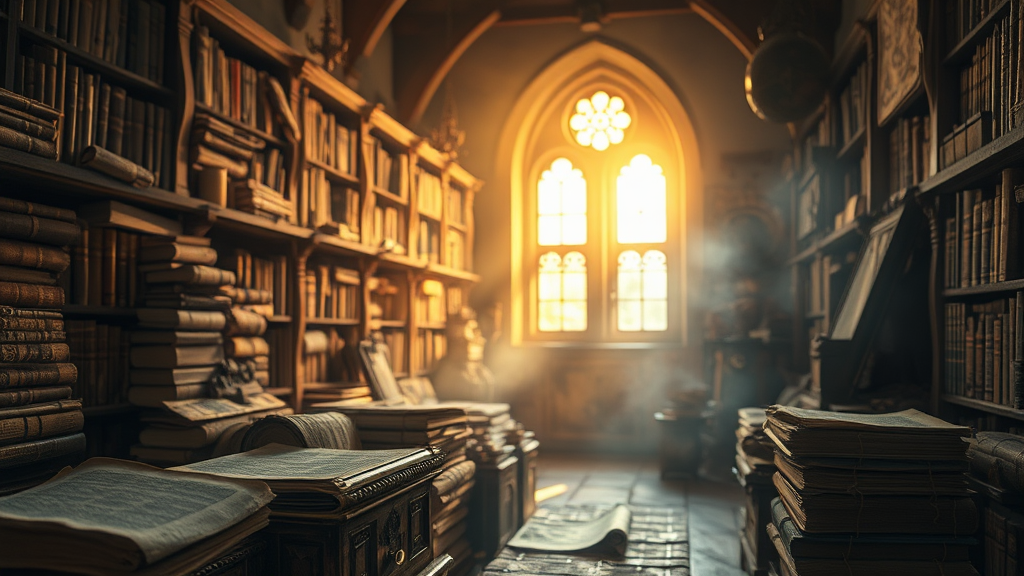Ancient dusty and weathered mystical scrolls and tomes in a medieval library, captured during the enchanting magic hour, with a masterful touch of professional photography and octane rendering. The scene is hyper-realistic, bathed in stunning natural sunlight, featuring a dynamic composition with sharp focus and exquisite bokeh effects. The atmosphere is enriched with an analog style that feels almost out of time, presenting a sense of wonder and curiosity. The scene avoids any modern distractions, focusing solely on the beauty of the ancient and the mystical captured through a lens.