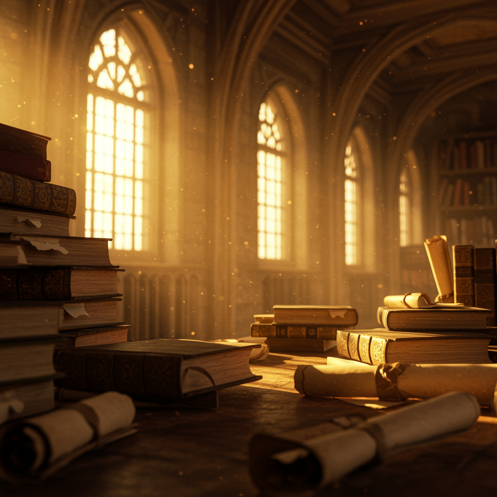 Ancient dusty and well-worn tomes and scrolls fill a medieval library, sunlight streaming through tall windows casting a warm glow that illuminates the scene with golden hues; professional photography captures hyper-realistic details in dynamic composition, sharp focus accentuating textures and the ambiance. Soft bokeh lends an analog charm, while the setting remains out of frame, inviting a sense of timeless mystery, blending realism with enchanting elements reminiscent of an age-old fantasy, absent of modern imperfections and distractions, embodying a sense of wonder and discovery.