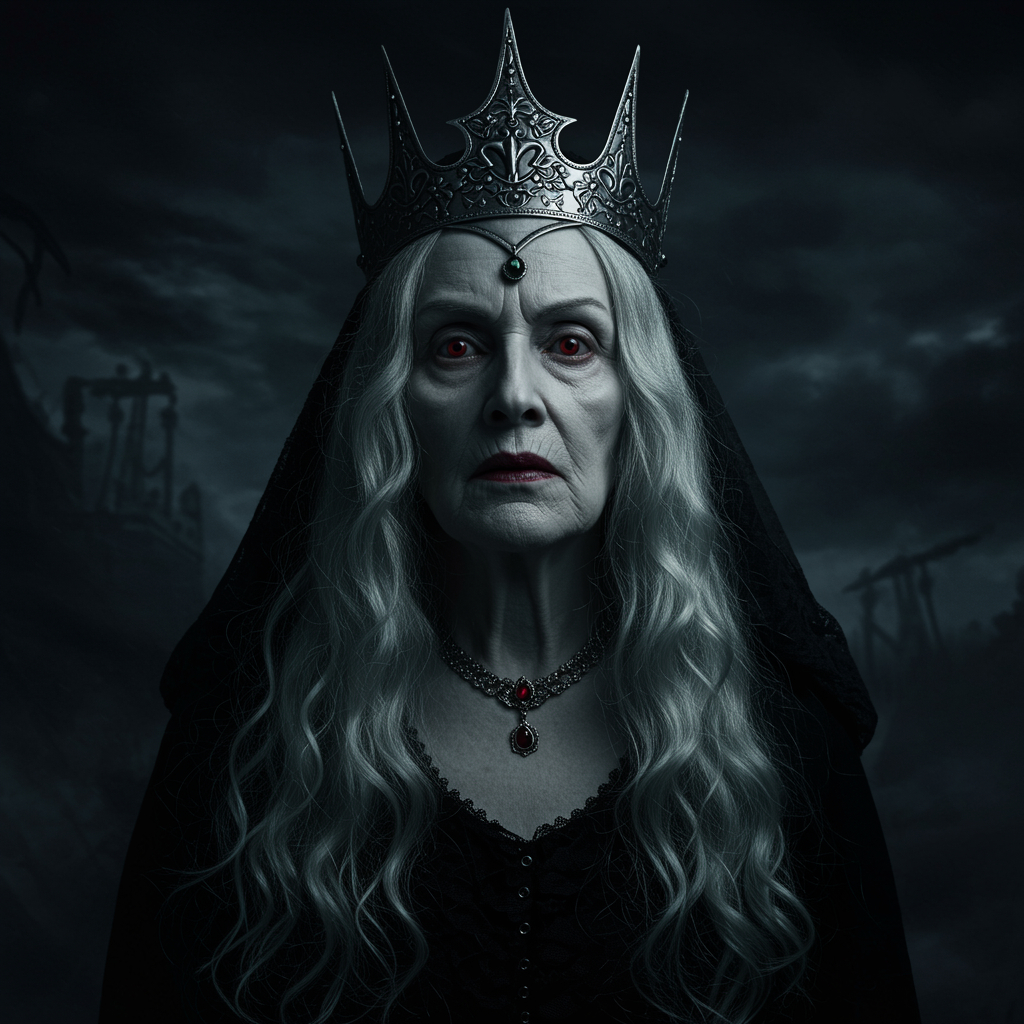 View this AI-generated image featuring ancient and regal elder female strigoi vampire exuding an aura of terrifying power her features ultra detailed and haunting under dramatic high contrast lighting her gaze is piercing and timeless set against a foreboding dark background with an atmosphere blend