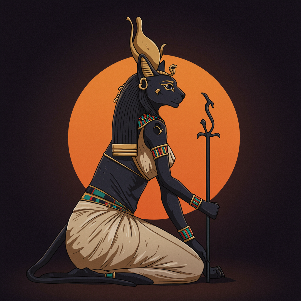 Ancient feline deity Basthet of Egyptian mythology, revered for her dual nature, embodies grace and protection, with a lioness' strength cloaked in a cat's agility, presiding over home and hearth, music and dance, her essence infused with the mysteries of the moon and the warmth of the sun, guarding the pharaohs and whispering to the hearts of those who seek her wisdom.