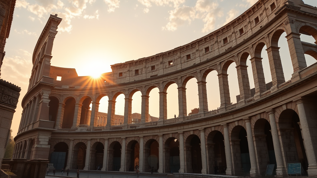 Ancient Roman Colosseum in majestic solitude, behemoth structure dwarfing the diminished sun, fading light dancing across columns, latticework of arches, and vaulted ceilings, radiating luminescence in hyper-realistic detail, texture of travertine limestone and tuff stone etches rich history, din of ceaseless ravines and verdant vines spreads, sun's final vestiges casting prayærubesque shadows, layered atmosphere lacks significance, lack of human presence elevates to awe-inspiring scale.