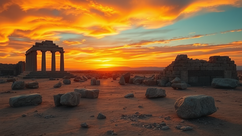 Ancient ruins lie scattered across a deserted landscape under a brilliant sunset, the sky ablaze with epic hues. This cinematic scene captures the intricate details of each weathered stone, the sharp focus bringing out the texture and history etched into the remains. The composition is reminiscent of a studio photo, with carefully balanced lighting that highlights the contrast between the vibrant sky and the somber tones of the earth below. Inspired by Greg Rutkowski's style, the image showcases a sense of grandeur and timelessness, drawing the viewer into a world where past and present collide in stunning clarity, trending on ArtStation with its highly detailed and intricate design.