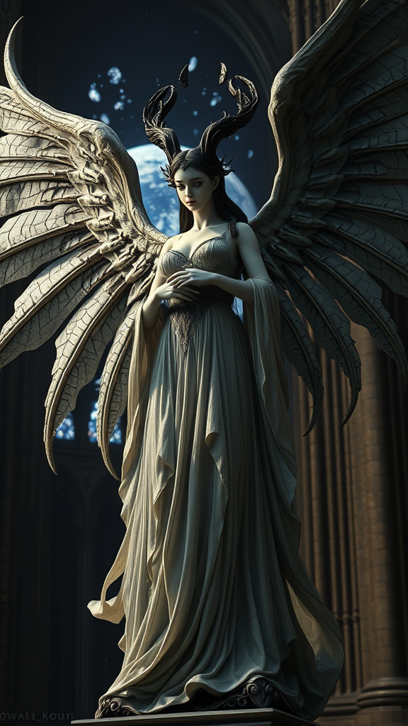 Ancient sculptural demonic female angel, Rucifer essence, blending gothic and baroque style, adorned in a flowing veil dress, six expansive wings unfurling, a fallen angel crowned with a shadowy halo, poised within a vast gothic cathedral, intricately ornate and detailed in low contrast. Capture the essence of Guillermo del Toro's style, a full-body portrait that is hyper-realistic, sculpted with precision in Zbrush. Display from an epic perspective, employing the cinematic details and lighting reminiscent of an octane render. Volumetric light accentuates the photorealistic composition, rendered with the prowess of Unreal Engine 5 in an 8k output. Crafted as an art sculpture with elements of bone, demonstrating ultra-detailed technical precision, guided by the rule of third, set within a dark, epic scene showcasing planet Earth illuminated from behind.
