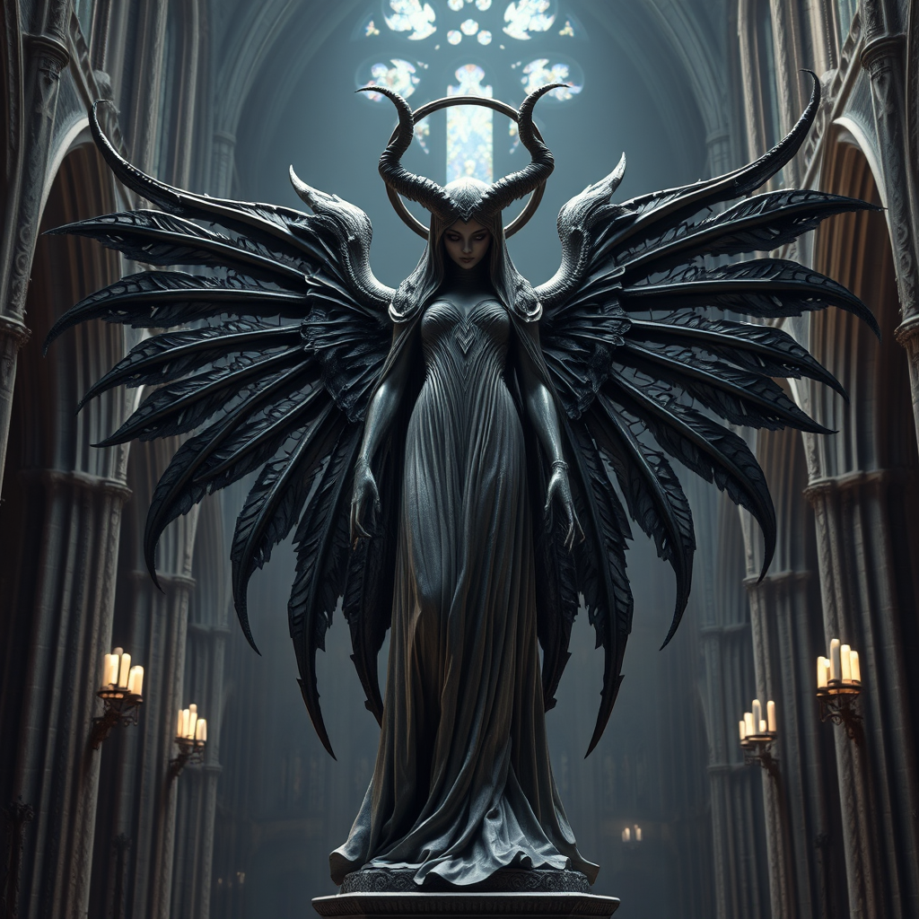 Ancient sculptural demonic female Angel, Rucifer-inspired, blending gothic and baroque artistry, adorned in a flowing veil dress; six elongated wings spread dramatically behind her, a shadowy halo casting an eerie glow. Situated within an expansive gothic cathedral, the sculpture is ornate and finely detailed, capturing a low contrast yet intricate aesthetic. Embrace the visionary style of Guillermo del Toro with a full body portrait, rendered in hyper-realistic detail using ZBrush. This epic scene captures a unique perspective, with octane render and volumetric, cinematic lighting that enhances the dark atmosphere. The composition follows the rule of third, exhibiting photorealistic precision and ultra-detailed craftsmanship. Rendered in Unreal Engine 5, the 8k sculpture is intricately constructed, merging art and bone with technical mastery. In the background, Earth is illuminated softly, adding an ethereal glow to the scene.
