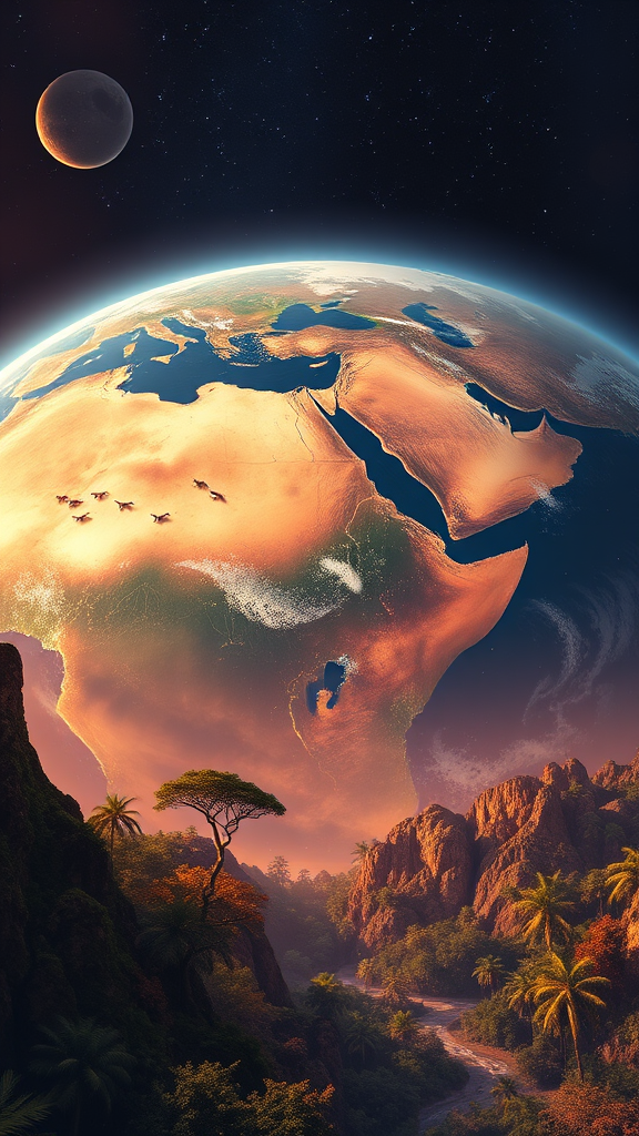 Ancient supercontinent where all Earth's lands were united, teeming with diverse prehistoric life and unique ecosystems, showcasing the shared ancestry of modern continents through dramatic landscapes and vibrant tropical forests.