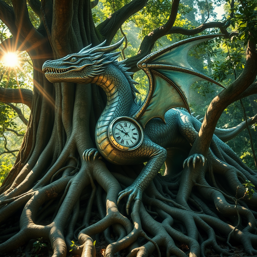 Ancient tree roots, imbued with mystical energy, entangle a majestic chrono dragon, shimmering scales reflecting the passage of time, intricate details showing the tension between nature's magic and the dragon's temporal powers, sun-dappled light filtering through dense foliage, casting ethereal patterns on the scene, evoking a sense of wonder and timelessness.
