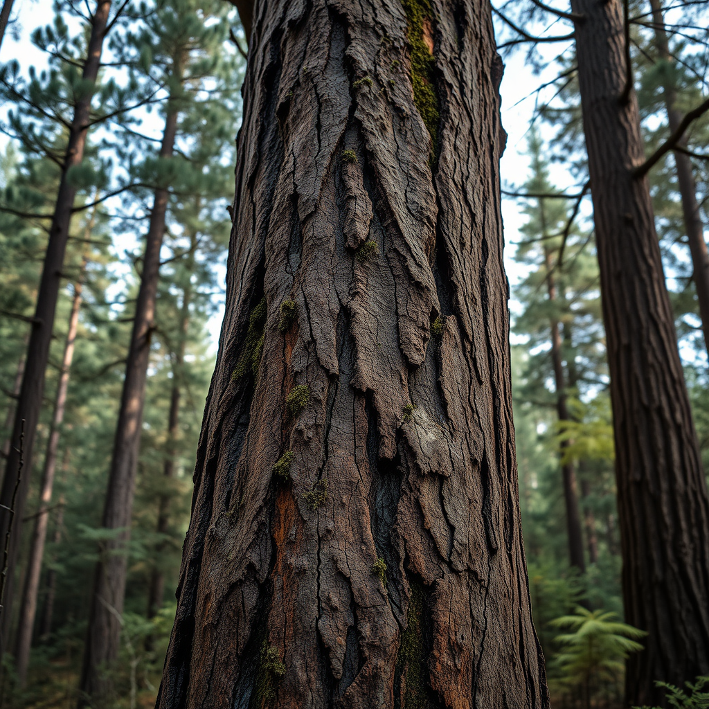 Ancient tree trunk, intricately detailed bark, photorealistic texture, vibrant HDR quality, towering pine tree in a lush woodland backdrop, textured bark with moss and ferns, complex and highly detailed features, vivid colors, clumsy artisan style, lifelike expressive eyes, smooth and polished surface, expertly carved details.