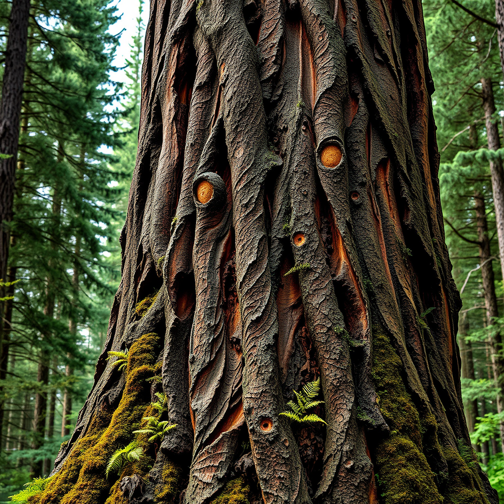 Ancient tree trunk, intricately detailed bark, photorealistic quality, HDR effects, towering pine, vibrant forest background, textured bark, delicate moss and ferns, complex patterns, richly detailed, brightly saturated colors, imperfect sketch, lifelike eyes, elegant finish, smoothly carved appearance.
