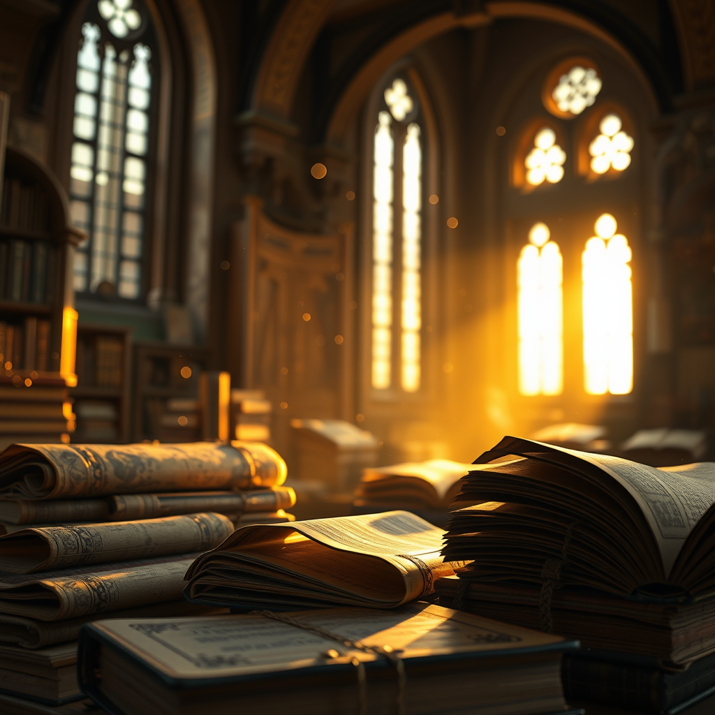 Ancient, weathered magic scrolls and leather-bound books in a medieval library bathed in the soft, golden glow of magic hour, captured in hyper-realistic professional photography with octane render quality. The scene showcases a dynamic composition with sharp focus and beautiful bokeh effects, imbuing an analog charm. Elements drift slightly out of frame, enhancing a sense of mystery, while sunlight streams through tall windows, highlighting dust motes in the air. This captivating image, blending elements of realism and subtle fantasy, evokes a timeless, enchanting atmosphere.