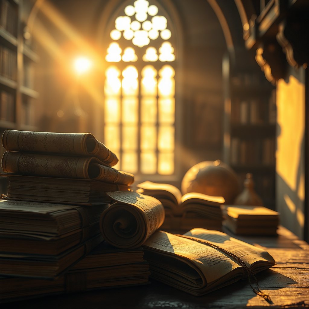 Ancient, weathered magical scrolls and books in a medieval library bathed in the warm glow of magic hour; captured through professional photography with hyper-realistic detail and stunning sunlight. The dynamic composition features sharp focus and a soft bokeh background, lending depth to the analog-inspired scene. Elements outside the frame suggest a world beyond the shot, enhancing the atmosphere without the distraction of characters or artificial elements.