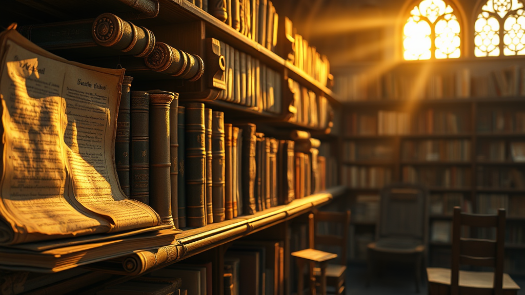 Ancient, weathered scrolls and mystical tomes lining the shelves of a medieval library, captured during the enchanting magic hour. The scene is portrayed through professional photography with an octane render, creating a hyper-realistic image bathed in amazing sunlight. The dynamic composition features sharp focus on the dusty textures, accented with a gentle bokeh effect. The atmosphere is analog-style with elements slightly out of frame, evoking a sense of timeless adventure. No digital artifacts or errors disrupt the authentic, richly detailed scene.