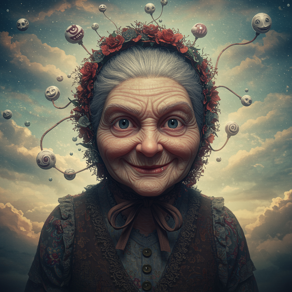 Ancient yet lively grandmother with a mischievous grin, enveloped in a surreal sky filled with wild hallucinations. Inspired by Mundford, this baroque maximalist style mixes chibi elements from Artificial Nightmares with the whimsical darkness of Tim Burton and the polished realism of Stanley Artgerm. Her face is a tapestry of extremely detailed features with piercing, sharp eyes that tell untold stories. The entire composition is a harmony of ultra-realistic, high-definition artistry, with intricate details rendered in stunning octane quality, as seen trending on ArtStation. It's a masterpiece of photorealistic concept art, capturing soft, natural volumetric cinematic lighting in a chiaroscuro style reminiscent of Raphael and Caravaggio. Adding touches of Greg Rutkowski's ethereal fantasy, Beeple's digital audacity, Beksinski's haunting surrealism, and Giger's organic intricacy, this piece transcends the conventional, a perfect oil on canvas that is both a masterful award-winning photograph and a visual symphony, echoing the timeless elegance of 8k artistic photography.