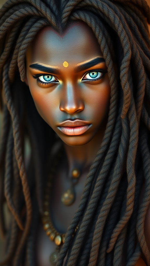 Androgynous Hanuman-inspired figure, captivating portrait photograph, gentle oval jaw, exquisite and delicate features, strikingly beautiful visage, intricately dreadlocked hair with flowing long bangs and a cascading long ponytail, vibrant blue-green eyes reminiscent of Hindu artistry, subtly enchanting alterations enhancing the core essence.