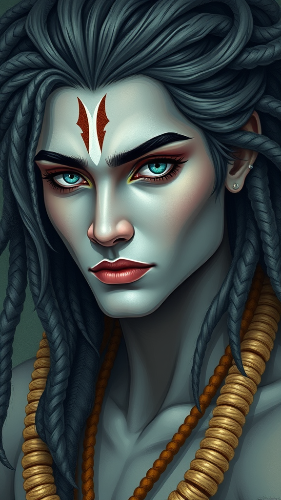 Androgynous Hanuman-inspired portrait, featuring an oval jaw and delicate features, captivating beautiful face, dreadlocked hair with long bangs and an elegant ponytail, striking bright blue-green eyes, infused with elements of traditional Hindu art.