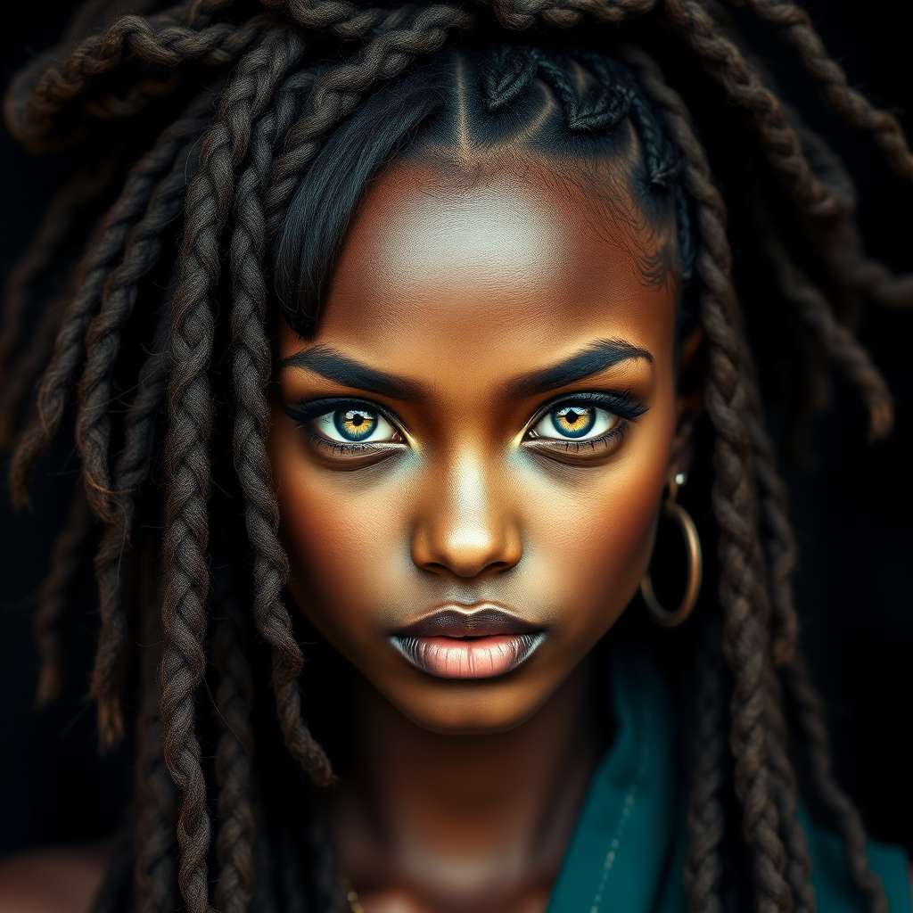 Androgynous Hunuman portrait, striking photograph capturing an oval jaw and delicate features, featuring a beautiful face framed by intricate dreadlocked hair, long elegant bangs, a flowing ponytail, expressive bright teal eyes, inspired by the elegance of Hindu art.