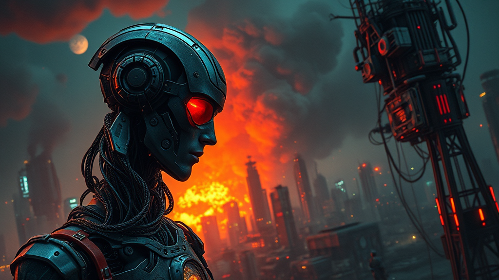 View this AI-generated image featuring a cyberpunk android deep in contemplation of a looming apocalypse intertwined with steampunk elements featuring a cinematic focus the scene exudes a vivid octane render style resembling a highly detailed videogame asset the composition follows the principles of