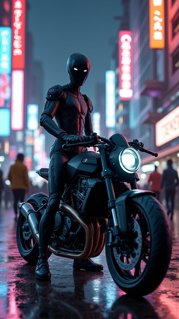 View this AI-generated image featuring a sleek android equipped with a matte black cybernetic and futuristic exo suit stands confidently beside a high tech motorcycle amidst the bustling streets of a vibrant cyberpunk city neon lights cast vivid reflections off the slick surfaces enhancing the cinem