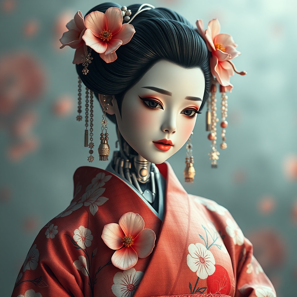 View this AI-generated image featuring android geisha adorned in a flowery kimono featuring delicate robotic elements high definition 8k detail cinematic atmosphere intricate patterns woven into the fabric. Created using advanced AI technology, this image showcases creative visuals, AI artwork. Perf