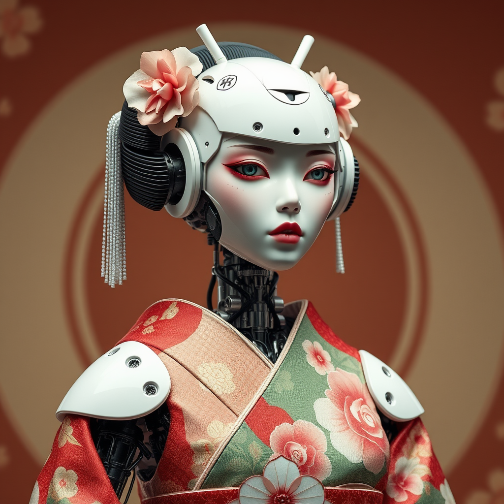 Android geisha adorned in a mechanical, flower-patterned kimono, intricate robotic features integrated seamlessly with traditional elegance.