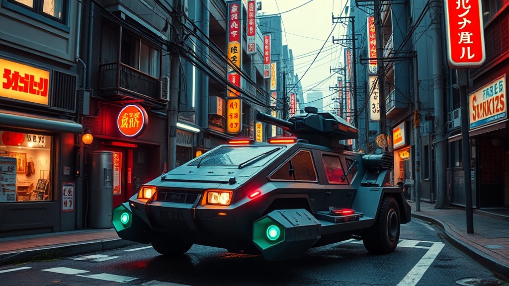 View this AI-generated image featuring a_neo_punksteam_futuristic_military_vehicle_navigating_through_winding_backstreets_of_a_neon_lit_japanese_urban_landscape. Created using advanced AI technology, this image showcases creative visuals, AI artwork. Perfect for creative projects, digital art, inspi