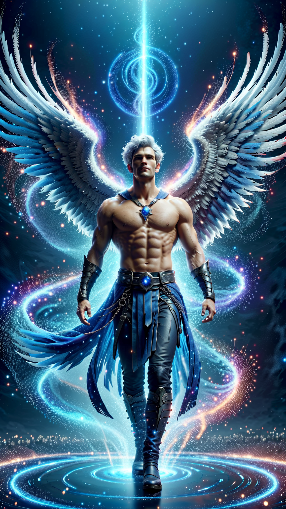 Angel, celestial, Angel of the Blue Star (Rigel). Hypermasculine male. Tall, muscular, strong, wide shoulders, broad chest, narrow waist, powerful legs, Olympian body. Fair, pale skin. Handsome, manly face. Strong brow, chiseled jaw. Electric blue eyes, soulful and deep. Short wavy fade hairstyle {{{short hair}}} with slightly longer hair towards the front of his head {{white hair}} . A Cerulean blue silk band tied around his forehead and brow. Shiny silver pauldrons accented with sapphires on both shoulders, A silver chain with a sapphire pendant around his neck. He wears a metallic blue harness on his chest, and metallic blue bracers strapped to his arms. An ornate silver belt with sapphires around his waist. He wears a sapphire blue loincloth with silver edges/piping , the loincloth covering an impressive bulge and exposing his strong, muscular legs. Knee high metallic, blue boots of the same color. His enormous, feathery Angel wings are predominantly cobalt blue, gradating into lighter shades of blue towards the outer parts of his wings. He carries a huge battle sword made of blue flames, and he radiates a deep blue aura, for he is the Angel of the Blue Star. Full body pose. He is somewhere amongst the stars.