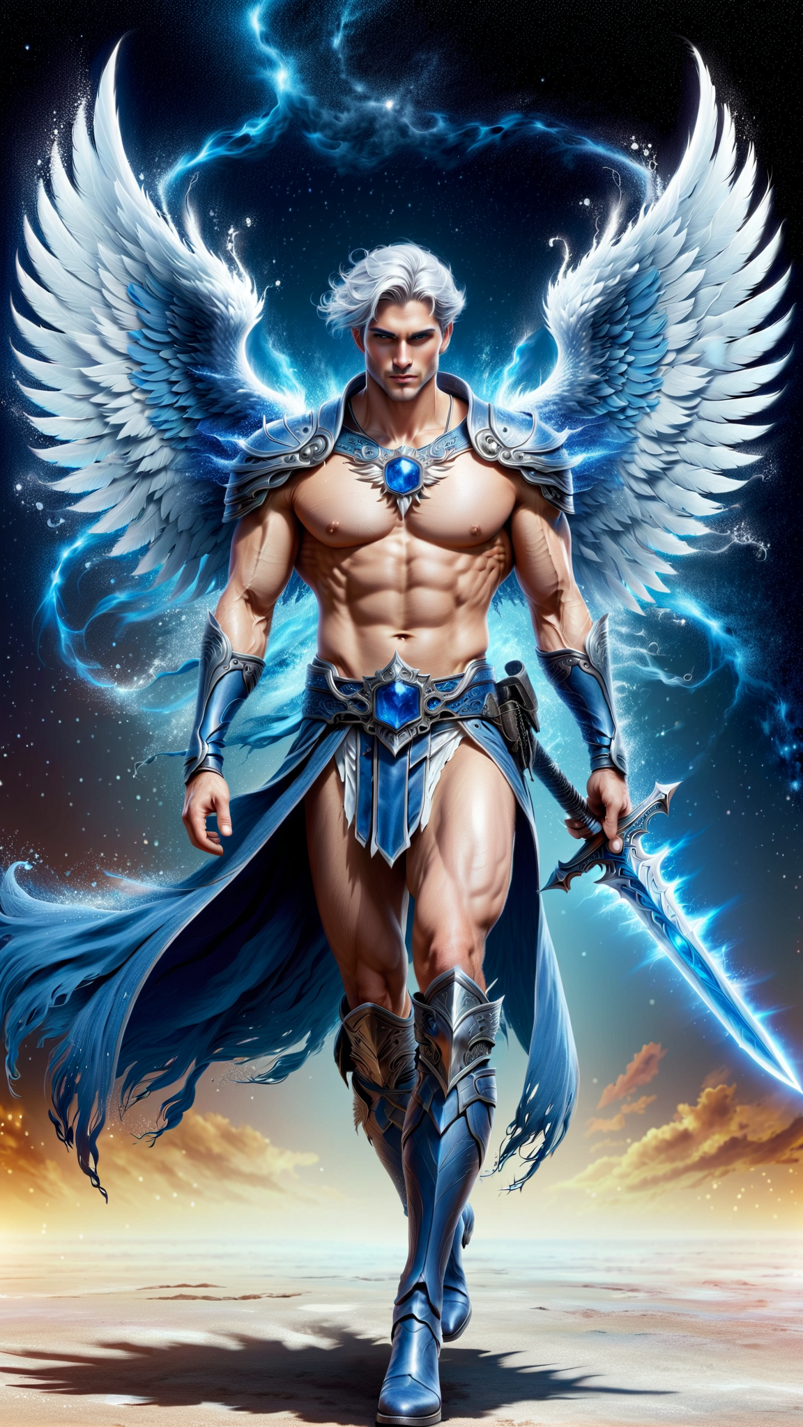 Angel, celestial, Angel of the Blue Star (Rigel). Hypermasculine male. Tall, muscular, strong, wide shoulders, broad chest, narrow waist, powerful legs, Olympian body. Fair, pale skin. Handsome, manly face. Strong brow, chiseled jaw. Electric blue eyes, soulful and deep. Short wavy fade hairstyle {{{short hair}}} with slightly longer hair towards the front of his head {{white hair}} . A Cerulean blue silk band tied around his forehead and brow. Shiny silver pauldrons accented with sapphires on both shoulders, A silver chain with a sapphire pendant around his neck. He wears a metallic blue harness on his chest, and metallic blue bracers strapped to his arms. An ornate silver belt with sapphires around his waist. He wears a sapphire blue loincloth with silver edges/piping , the loincloth covering an impressive bulge and exposing his strong, muscular legs. Knee high metallic, blue boots of the same color. His enormous, feathery Angel wings are predominantly cobalt blue, gradating into lighter shades of blue towards the outer parts of his wings. He carries a huge battle sword made of blue flames, and he radiates a deep blue aura, for he is the Angel of the Blue Star. Full body pose. He is somewhere amongst the stars.